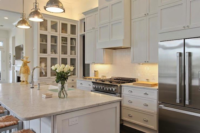 Transitional Painted White Kitchen With Grey Stained Peninsula Crystal Cabinets